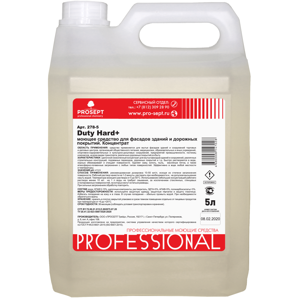 Меры предосторожности: используйте защитную одежду, защитные перчатки и защиту глаз/лица. Избегать попадания на кожу и в глаза. В случае попадания – обильно промыть водой. При необходимости обратиться к врачу.Хранение: хранить в плотно закрытой упаковке в сухом темном помещении отдельно от пищевых продуктов при температуре от +5 до +25°С. Срок годности: 36 месяцев (соблюдать условия транспортировки и хранения). ТУ 20.41.32-023-58873520-2020 Арт. 278-5 Отзывы о Средство Моющее Prosept Duty Hard + 5л 278-5 / Просепт.Отзывов пока не было. Вы можете оставить его первым