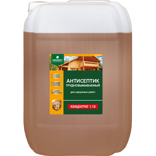 Описание Антисептик для Наружных Работ Prosept Exterior 30л Концентрат (1:19) для Защиты и Консервации Древесины на Открытом Воздухе / Просепт Икстериор.PROSEPT EXTERIOR предназначен для защиты и консервации древесины на открытом воздухе при непосредственном воздействии атмосферных осадков, почвенной влаги, гигроскопическом и конденсационном увлажнении. Средство обеспечивает защиту различных пород древесины от гниения, плесени, синевы и насекомых-древоточцев. Антисептик предотвращает и останавливает уже начавшиеся процессы разрушения древесины биологическими агентами.