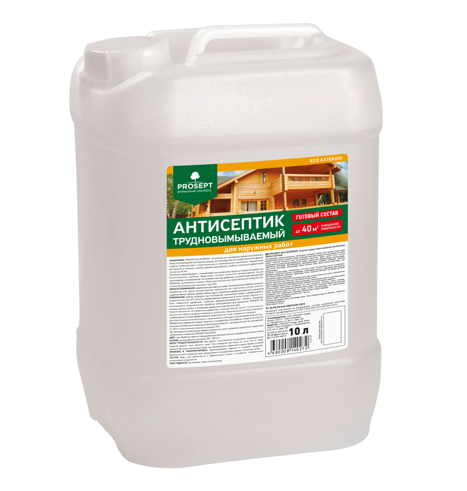 Описание Антисептик для Наружных Работ Prosept Eco Exterior 10л для Защиты и Консервации Древесины на Открытом Воздухе / Просепт Эко Икстериор.PROSEPT ECO EXTERIOR — антисептик для наружных работ. Предназначен для защиты и консервации древесины на открытом воздухе при непосредственном воздействии атмосферных осадков, почвенной влаги, гигроскопическом и конденсационном увлажнении. Средство обеспечивает защиту различных пород древесины от гниения, плесени, синевы и насекомых-древоточцев.