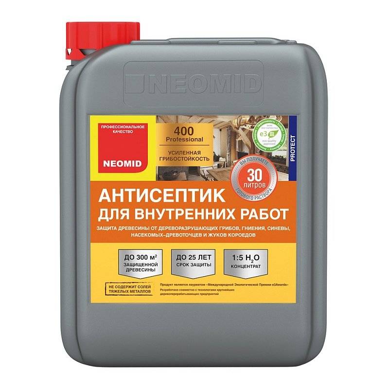 Описание Антисептик Neomid 400 5кг для Внутренних Работ, Бесцветный, Концентрат (1:5) / Неомид 400.NEOMID 400 ECO — новое высокоэффективное деревозащитное средство на водной основе для внутренних работ. Предназначено для усиленной защиты древесины на срок до 25 лет от гниения, поражения дереворазрушающими и деревоокрашивающими плесневыми грибам.