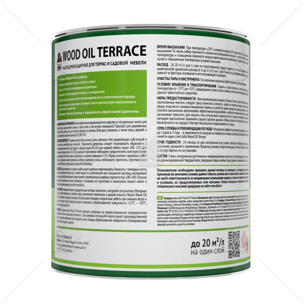 Высокоэффективное деревозащитное масло для обработки террас и садовой мебели снаружи, а также полов и стен внутри помещений. Подходит для деревянных строений из бруса, бревна, доски, для покрытия обшивок из вагонки, блокхауса, планкена, а также окон, дверей и других конструкций из древесины, фанеры, ДСП, ДВП, ОСП.