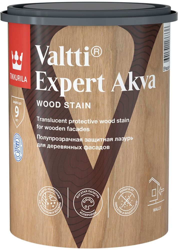 Хотите сохранить красоту и естественность деревянных фасадов как можно дольше? Выбирайте Valtti Expert Akva, ведь его усовершенствованная формула позволяет сохранить природные свойства деревянных поверхностей на срок до 9 лет. Кроме того, лазурь элегантно подчеркивает структуру дерева и придает поверхности декоративный эффект. Valtti Expert Akva – изысканная защита для деревянного фасада! Усиленная воском защита от влаги и УФ-фильтр Для того, чтобы фасад вашего дома не страдал от воздействия различных атмосферных явлений, используйте только качественные материалы. Valtti Expert Akva – эксперт по противодействию природным явлениям. Просто нанесите его на деревянную поверхность и позвольте ему сделать свою работу. Усиленная воском формула помогает противостоять влаге, а УФ-фильтр защищает поверхность от воздействия солнечных лучей. Насыщенный естественный оттенок дерева – вот что такое Valtti Expert Akva! Экстра-защита от синевы, плесени и гнили Одним из основных слабых мест деревянных фасадов по праву считают подверженность биопоражениям. Но Valtti Expert Akva способен решить и эту проблему! Специальные компоненты, содержащиеся в его составе, надежно противостоят самым распространенным биологическим явлениям, встречающимся в различных климатических зонах, таким как, синева, плесень и гниль. Valtti Expert Akva - не оставьте биопоражениям ни единого шанса! 7 готовых цветов + 40 колеруемых оттенков Выбирая Valtti Expert Akva, Вы выбираете надежную защиту деревянного фасада. А как насчет цвета? Valtti Expert на высоте и в этом вопросе. Решение за вами: воспользоваться одним из 7 готовых цветов (бесцветный, сосна, палисандр, тик, белый дуб, рябина, орегон) или заколеровать лазурь в один из 40 индивидуальных оттенков фирменной коллекции Tikkurila Valtti. Подчеркните красоту деревянного фасада, придав ему насыщенный естественный цвет. ТЕХНИЧЕСКИЕ ДАННЫЕ