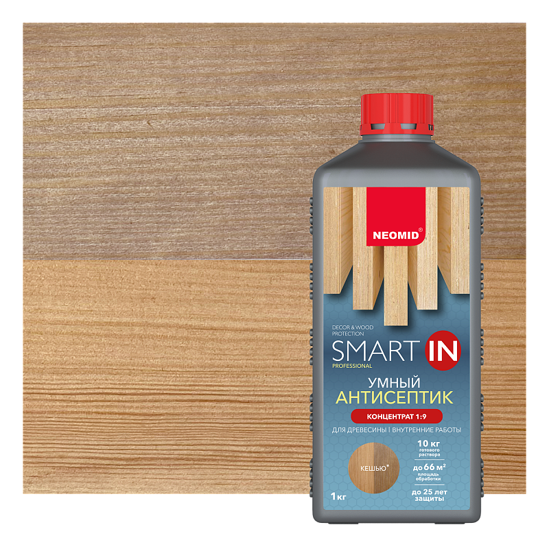 Описание Декоративный Антисептик-Концентрат (1:9) Neomid Smart In 1л Кешью для Древесины без Запаха / Неомид Смарт.