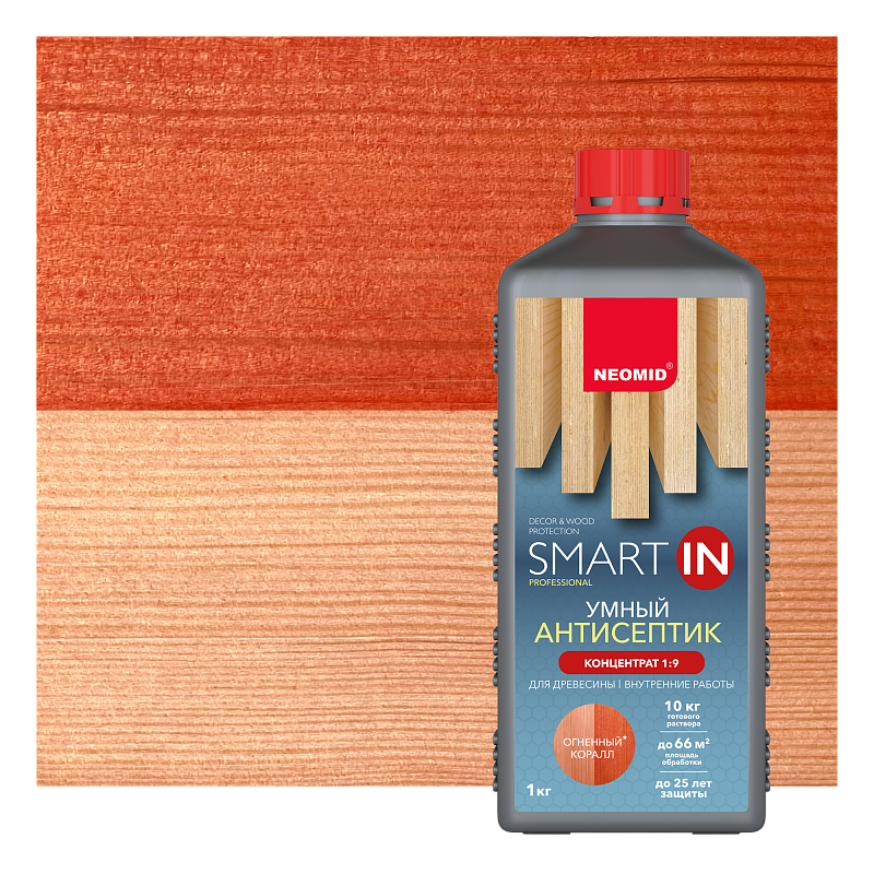 Описание Декоративный Антисептик-Концентрат (1:9) Neomid Smart In 1л Огненный Коралл для Древесины без Запаха / Неомид Смарт.