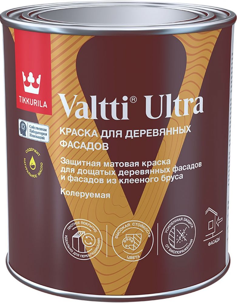 Описание Краска Для Деревянных Фасадов Tikkurila Valtti Ultra 2.7л Белая, Матовая / Тиккурила Валтти Ультра.Назначение:Защитная матовая краска для дощатых деревянных фасадов и фасадов из клееного бруса. Предназначена для наружной окраски необработанных, обработанных промышленным способом или окрашенных ранее красками для наружных работ деревянных поверхностей. Область применения:Применяется для окраски дощатых наружных стен (включая деревянные панели, блок-хаус, планкен, вагонку) и фасадов из клееного бруса, обшивочных досок, заборов, беседок, навесов и других подобных поверхностей. Подготовка поверхности:Условия при окраске Окрашиваемая поверхность должна быть сухой. Во время обработки и высыхания температура воздуха должна быть не ниже 5?m;С и относительная влажность воздуха – не выше 80%. Нанесение продукта:Наносится широкой кистью с искусственной щетиной или распылением. Колеровка:База: А и С. Колеруется по каталогу Tikkurila «Деревянные Фасады». Для колеровки в пастельные и насыщенные оттенки воспользуйтесь компьютерной колеровкой Tikkurila. База А также может использоваться в качестве белой краски. База С используется только в колерованном виде! При окрашивании в яркие цвета на базе С рекомендуется предварительно нанести слой краски базы А, заколерованной в похожий оттенок. Во избежание различий в оттенке используйте краску одной партии. При окраске поверхности большой площади рекомендуется смешать необходимое количество краски в одной емкости, чтобы обеспечить равномерный оттенок. Условия транспортировки и хранения:При температуре выше 5°С в плотно закрытой таре, предохраняя от воздействия влаги, тепла и прямых солнечных лучей. Не ставить вверх дном. Продукт следует использовать в течение 2 недель после добавления колеровочных паст, что обусловлено возможным влиянием паст на свойства колерованного продукта при его хранении. С этим товаром смотрятОтзывы о Краска Для Деревянных Фасадов Tikkurila Valtti Ultra 2.7л Белая, Матовая / Тиккурила Валтти Ультра.Отзывов пока не было. Вы можете оставить его первым