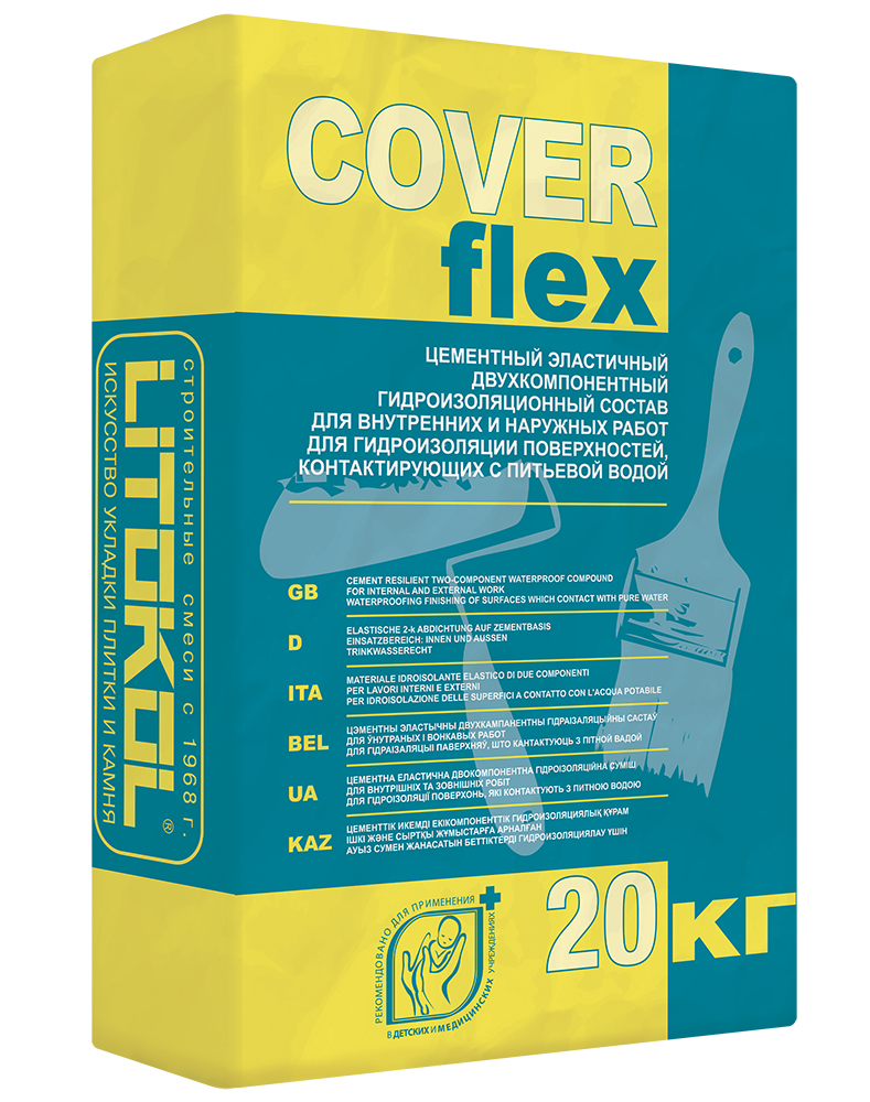 Повышенная эластичность. Идеально для поверхностей с нестандартной геометрией (сфера, ломаные поверхности или поверхности с большим количеством углов). Эластичность при отрицательной температуре. Высокая прочность сцепления с основанием. Отсутствие швов. Низкий расход. Устойчивость к агрессивному воздействию хлоридов, сульфатов и углекислому газу. Экологичность. Соответствует классу CM02P. Применяется для наружных и внутренних работ в отапливаемых и неотапливаемых, влажных помещениях всех типов: жилые помещения, подвалы, подземные парковки; фундаменты, смотровые колодцы, лифтовые шахты; применяется в системе «теплый пол». Подходит для фасадов, цоколей, отмосток, фонтанов, бассейнов, SPA и резервуаров для воды. Цвет: светло-серый Пропорции при приготовлении: 10 кг COVERFLEX B на 20 кг COVERFLEX A Прочность сцепления с основанием (адгезия): ≥ 1,7 МПа Прочность сцепления с основанием (адгезия) после выдержки в воде: ≥ 1,4 МПа Температура применения: от +5 °С до +35 °С Температура эксплуатации: от -50 °С до +90 °С Минимальное количество слоёв нанесения: 2 слоя Рекомендуемая толщина одного слоя: 1 мм Максимальная общая толщина: 2 мм Расход при толщине слоя 1 мм: 1,6 кг/м?2; Время использования: около 60 мин Время высыхания одного слоя: около 3-4 ч Водонепроницаемость: W10 Способность перекрывать трещины: 1,5 мм Способность перекрывать трещины при -20 °С: ≥ 0,75 мм Водопоглощение при капиллярном подсосе: ≤ 0,1 кг/м?2;*ч??rime;? Группа горючести: НГ (негорючий) С этим товаром смотрятОтзывы о Гидроизоляция Полимерцементная 2-х комп. Litokol Coverflex 20кг Компонент A.Отзывов пока не было. Вы можете оставить его первым