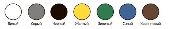 Белый,желтый,зеленый,серый,коричневый,синий,черный