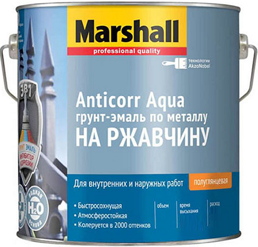 Описание Грунт-эмаль 3в1 на Ржавчину Marshall Anticorr Aqua 9л по Металлу, без Запаха, Белый / Маршалл Антикор Аква.Полуглянцевая грунт-эмаль по металлу на водной основе «3 в 1»: наносится на ржавчину без грунта и предотвращает коррозию. Быстро сохнет и почти не пахнет. Возможна компьютерная колеровка по большинству известных вееров. Образует прочное и эластичное покрытие способное выдержать перепады температур от -30°С до 80°С, а также воздействие химических средств (средства бытовой химии, слабые растворы солей и щелочей).
