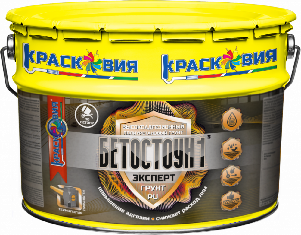 Описание Грунтовка Полиуретановая для Бетона 10л Красковия Бетостоун-1 Эксперт «Грунт-PU» Высокоадгезионный, Обеспыливающий, Укрепляющий.Бетостоун-1 Эксперт «Грунт-PU» - высокоадгезионный, обеспыливающий и укрепляющий полиуретановый грунт для подготовки бетонных поверхностей подвергающихся механическим, химическим и вибрационным нагрузкам, к окраске финишными полиуретановыми составами. Состав рекомендуется к применению на любых объектах промышленного и гражданского комплекса. Высокая скорость высыхания – позволяет провести работы в кратчайшие сроки, через 4 часа после нанесения грунта, можно наносить финишное покрытие; Удобство нанесения – однокомпонентный состав полностью готов к применению, не требует дополнительных манипуляций во время проведения работ; Создание водоотталкивающего барьера – плотная структура полиуретановых смол и укрепляющих аддитивов, формирующая после высыхания непроницаемый барьер, препятствующий проникновению воды и технологических жидкостей к поверхности, надежно предохраняет бетон от разрушения; Стойкость к перепадам температур – благодаря своей особенной формуле, нанесённый и полностью высохший грунт, обеспечивает защиту бетонной поверхности в диапазоне температур от -50 до +70°С. Бетостоун-1 Эксперт «Грунт-PU» обладая отличными качественными характеристиками, надёжно запечатывает поры бетонных и других минеральных оснований, а на низкомарочных поверхностях, демонстрирует увеличение их прочности после полного высыхания. РекомендованоПрименяется для защиты и упрочнения бетонных полов промышленного и гражданского назначения внутри помещений: