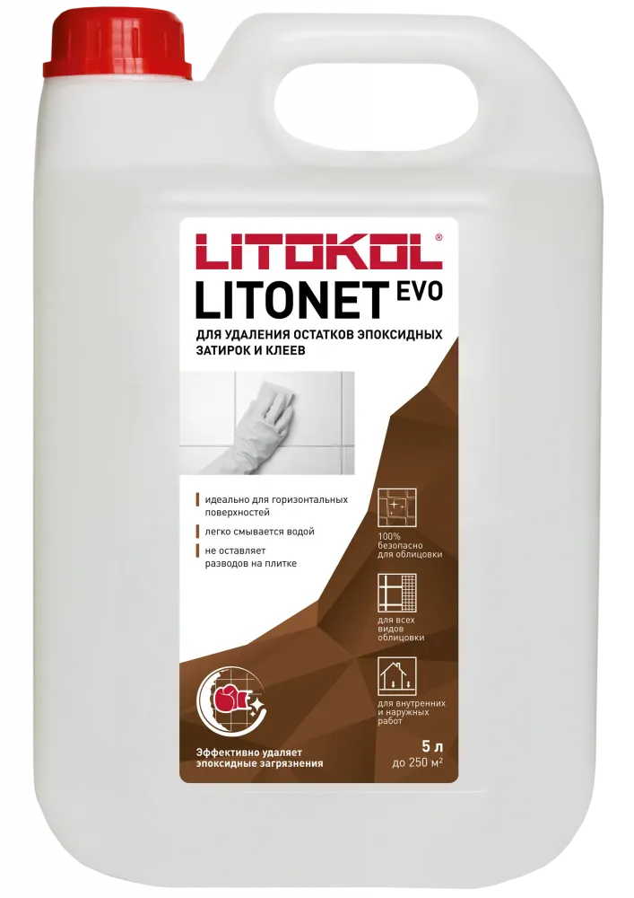 Описание Очиститель Щелочный Litokol Litonet Evo 5л Жидкий от Остатков Цементного Клея и Цементных ЗатирокLitokol LitoNet Evo - жидкий моющий концентрированный состав со щелочным pH. Состав может быть использован в различной концентрации в зависимости от степени загрязнения и сложности случая. LitoNet Evo неразбавленный моющий состав особенно эффективны при удалении остатков, разводов и пятен эпоксидных составов Starlike Evo, Starlike, Epoxyelite, Litopoxy, Epoxysruk X90 со всех типов керамической плитки, керамогранита, в том числе полированного, стеклянной или керамической мозаики и всех видов натурального камня, в том числе полированного, а также для удаления загрязнений и пятен от цементных материалов. При разведении LitoNet Evo с чистой водой, в пропорции от 1:10 до 3:10, может использоваться в качестве обезжиривающего щелочного моющего средства, которое идеально подходит для регулярной и частой очистки поверхностей от устойчивых загрязнений, таких как: