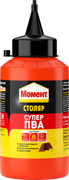 Момент Супер ПВА D2 является идеальным решением для склеивания всех пород дерева, ламината и изделий, изготовленных из материалов на основе древесины (ДСП, ДВП, МДФ и др).
