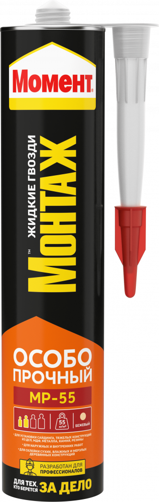 Момент Монтаж Особопрочный МР-55 для быстрого и надежного крепления тяжелых конструкций, требующих высокой прочности и долговечности. Незаменим при установке наружной обшивки, сайдинга, кровли, черновых полов, каменной облицовки, стеллажей, столешниц и т.д. Склеивание можно производить при температуре от -12°C до +45°C.