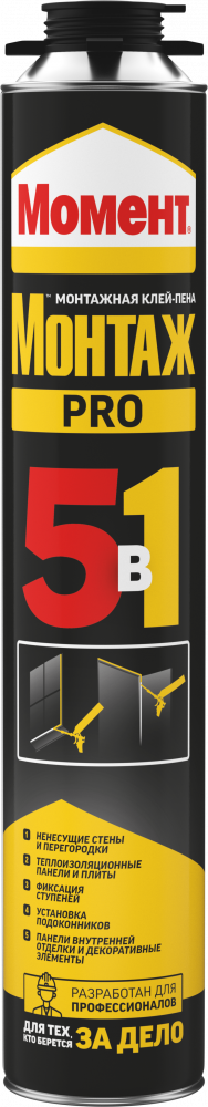 Момент Монтаж 5 в 1 клей-пена — это готовая к употреблению твердеющая под воздействием влаги сверхэффективная универсальная полиуретановая расширяющаяся клей-пена. Быстро и просто наносится при помощи специального пистолета-аппликатора. Для получения лучших результатов следует использовать проверенный и одобренный производителем продукт пистолет-аппликатор.