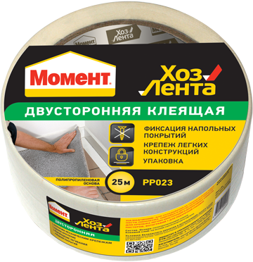 Двусторонняя клеящая лента Хозлента Момент. Отлично подходит для надежного соединения поверхностей и упаковки.