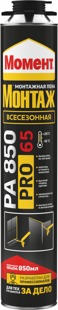 Профессиональная монтажная пена Момент Монтаж 65 Всесезонная представляет собой готовую к применению однокомпонентную полиуретановую пену, затвердевающую под воздействием влажности воздуха.