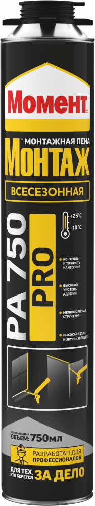 Профессиональная монтажная пена Момент Монтаж Всесезонная представляет собой готовую к применению однокомпонентную полиуретановую пену, затвердевающую под воздействием влажности воздуха. Применяется со специальным пистолетом для монтажных пен.