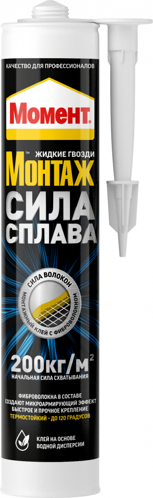 Монтажный клей Момент Монтаж Сила Сплава идеален для работы при высоких температурах (до 120 градусов). Термостойкий монтажный клей создан на водной основе.