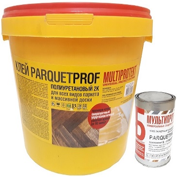 Описание Клей Паркетный 2-х комп. Мультипротект Parquetprof 10кг Полиуретановый, Эластичный.Применяется для укладки паркета любой толщины и длины, любых разновидностей древесины, паркетной и массивной доски, древесины с повышенной плотностью, торцевой древесины, фанеры. Клей обладает высокой адгезией к бетонну, древесине, металлу, плитке, любым видам стяжек, паркета, фанеры, ДСП, ЦСП, ОSB. Клей parquetprof отличается высокой влагостойкостью, температуростойкостью до +120°C и морозостойкостью до –30°C. Применяется для наружных и внутренних работ, на полах с подогревом. Клей не содержит воды, растворителей и не имеет запаха, не деформирует древесину. Легко наносится шпателем. Жизнеспособность до 90 минут.