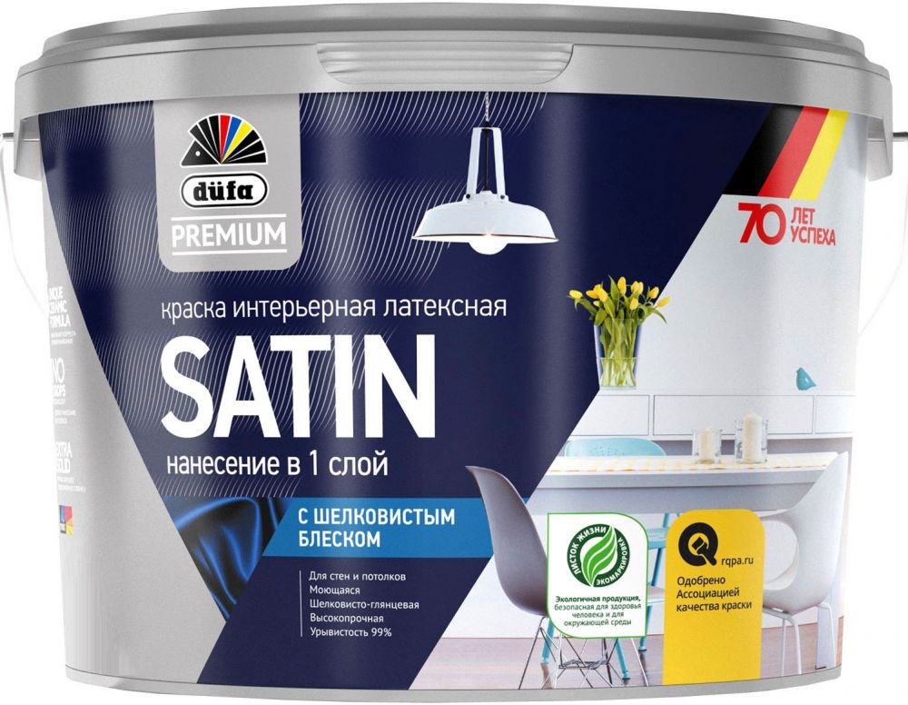 Описание Краска Интерьерная Латексная Dufa Premium SATIN 2.5л с Шелковистым Блеском.Серия düfa PREMIUM для внутренних работ разработана для получения высококачественного результата при покраске стен, элементов интерьеров и экстерьеров. Микрокристаллический мраморный наполнитель гарантирует высокую степень белизны, исключительную прочность и долговечность покрытия. Традиционная немецкая точность, современные технологии и высочайшее качество сырьевых компонентов красок этой серии обеспечивают достижение максимального декоративного эффекта, экономичный расход и комфортное нанесение.