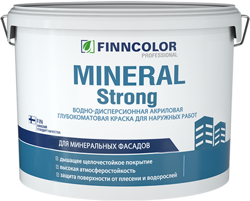 Атмосферостойкая фасадная краска Finncolor Mineral Strong / Финнколор Минерал Стронг глубокоматоваяФасадная краска Finncolor Mineral Strong образует паропроницаемое атмосферостойкое покрытие, при ремонтных работах фасадов по штукатурке, бетону, силикатному кирпичу и цементно-волокнистым плитам.ОсобенностиТип поверхностей: бетон, цементно-известковая штукатурка, фибро-(асбо-) цементные плиты