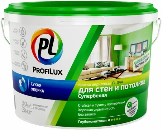 Описание Краска для Стен и Потолков ВД ProfiLux PL- 04А 3кг Супербелая, Акриловая.Назначение