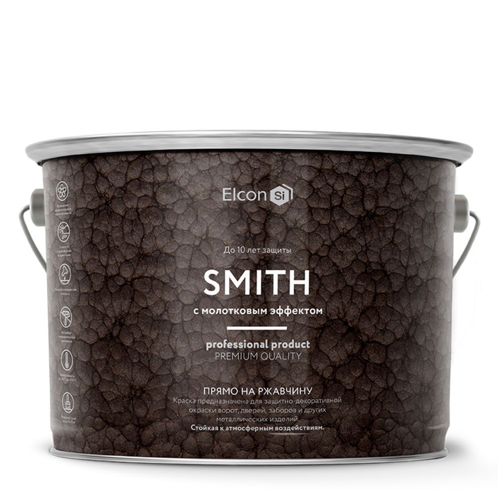 Краска Elcon Smith с молотковым эффектом предназначена для долговечной окраски металлических поверхностей снаружи и внутри помещений. Краску можно наносить на прокорродировавшую поверхность сразу после удаления рыхлой ржавчины. Компоненты, входящие в состав краски, преобразуют ржавчину в прочный защитный слой, препятствуют дальнейшей коррозии и образуют на поверхности металла прочное атмосферостойкое покрытие.