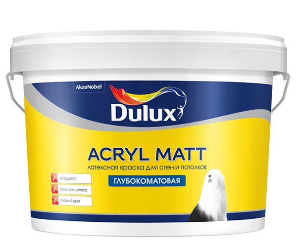 Описание Краска для Стен и Потолков Dulux Acryl Matt 9л Латексная, Глубокоматовая, Белая / Дюлакс Акрил Матт.*Глубокоматовая краска для стен и потолков: