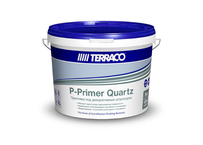 P-Primer Quartz («Кварц-Грунт») – это пигментированная и наполненная мелким кварцевым песком адгезионная грунтовка для наружного и внутреннего использования. Предназначена под текстурные и мозаичные штукатурки. Обеспечивает удобство нанесения текстурных штукатурок, минимизируя их сползание. Область применения: P-Primer Quartz предназначен для подготовки минеральных, цементных, известково-цементных и гипсовых оснований, в том числе при устройстве СФТК Terraco, а так же адсорбирующих необработанных бетонных и оштукатуренных поверхностей, перед нанесением любых текстурных покрытий, а так же материалов для создания объемных фактур. Допускается нанесение на прочные поверхности с нанесёнными полимерными шпатлёвками и красками. P-Primer Quartz не рекомендуется наносить на металл, старые плиточные покрытия, масляные краски, пластик и другие неминеральные основания, а также использовать в целях, не предусмотренных настоящей инструкцией. Свойства: образует прочную и равномерно шероховатую поверхность; без органических растворителей, экологически безопасен; имеет высокую атмосферостойкость; выравнивает и снижает впитываемую способность основания; повышает адгезию наносимых покрытий с основанием, уменьшает риск сползания покрытий имеющих большую толщину; имеет хорошую укрывистость и выравнивает цвет основания за один или несколько слоёв; препятствует реакции «омыления» материалов на основе синтетических смол при их нанесении на щелочные основания, таких как бетон, цементные штукатурки; снижает вероятность выхода высолов на поверхность основания. Подготовка поверхности: Основание должно быть чисты, обладать достаточной несущей способностью, сухим и очищенным от пыли, остатков краски, жира, воска, следов битума и других загрязняющих веществ. Пыль, непрочные участки основания и слабо держащийся поверхностный слой должны быть удалены. Трещины и дефектные участки основания должны быть предварительно отремонтированы ремонтными составами Terraco. Поверхности, не подлежащие грунтованию, должны быть защищены малярной лентой или полиэтиленовой пленкой. Нанесение продукта: Перед применением грунтовку следует тщательно перемешать. P-Primer Quartz рекомендуется наносить кистью, валиком или краскопультом ровным слоем, равномерно распределяя кварцевый наполнитель по поверхности, не допуская образования потеков и капель. В зависимости от состояния поверхности, вида и цвета декоративного материала, под которое готовится поверхность, может потребоваться нанесение грунтовки в 2 слоя для достижения полной укрывистости основания. Качественно подготовленное основание должно иметь однородный цвет. В первую очередь рекомендуется использовать материал с более ранней датой выпуска. Наносить декоративные покрытия рекомендуется после полного высыхания загрунтованной поверхности, но не ранее чем через 4 часа после нанесения P-Primer Quartz . Для максимального проявления адгезионных свойств загрунтованной поверхности, рекомендуется нанесение последующего покрытия не позднее 2-3-х дней после обработки P-Primer Quartz. Нанесение грунтовки P-Primer Quartz рекомендуется выполнять в сухих условиях при относительной влажности воздуха не более 80% и при температурах основания и окружающей среды от +5?С до +30?С. Инструменты для нанесения и оборудование после окончания работ следует 