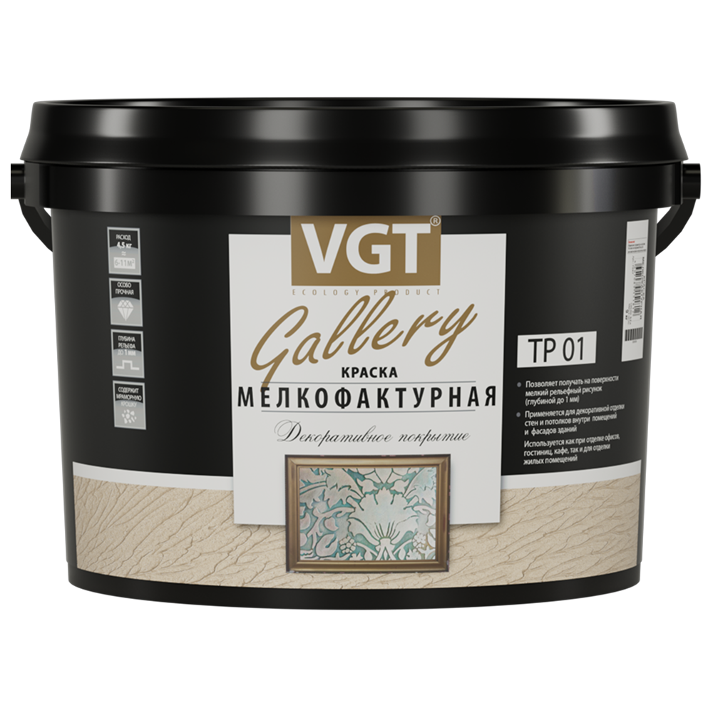 Описание Краска Мелкофактурная VGT Gallery TP 01 18кг Декоративная, Текстурная для Внутренних и Наружных Работ, Белая / ВГТ Фактурная.Мелкофактурная краска – это декоративное покрытие, позволяющее получать на поверхности мелкий рельефный рисунок, который зависит от структуры используемого валика.