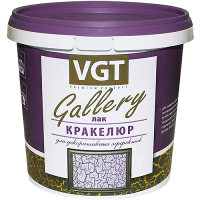 Лак представляет собой однородную вязкую жидкость белого цвета. После высыхания становится прозрачным. Готов к применению. Используется для внутренних работ в качестве промежуточного слоя между двумя водно-дисперсионными акриловыми красками ТМ „VGT” (ЛКМ) разного цвета, при этом, сам лак, оставаясь прозрачным, растрескивает финишную краску, проявляя в трещинах нижний слой.
