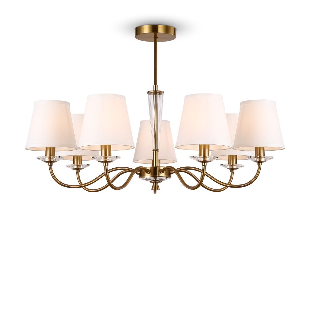 Металлическая арматура в двух оттенках на выбор: латунь и никель. Абажуры – текстиль белого цвета. Декоративные элементы из прозрачного стекла. Источник света – лампа с цоколем E14.