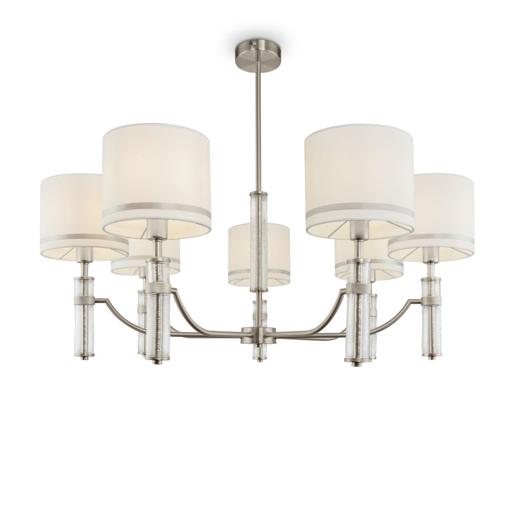 Эстетика неоклассицизма объединила светильники серии Albero – люстру на 7/5 ламп, бра и настольную лампу. Металлическая арматура цвета никеля подчеркнута оригинальным цилиндрическим декором из рельефного стекла – за счёт этого создается ощущение невесомости и легкости конструкции. Кремовые тканевые абажуры, обрамленные кантом, венчают композицию, придавая ей завершенный вид и даря мягкий, слегка приглушенный свет. Регулируемый подвес позволяет настроить оптимальную высоту люстры в зависимости от параметров помещения. Широкий выбор светильников в серии дарит возможность организовать комплексное, многоуровневое освещение в единой выдержанной стилистике.