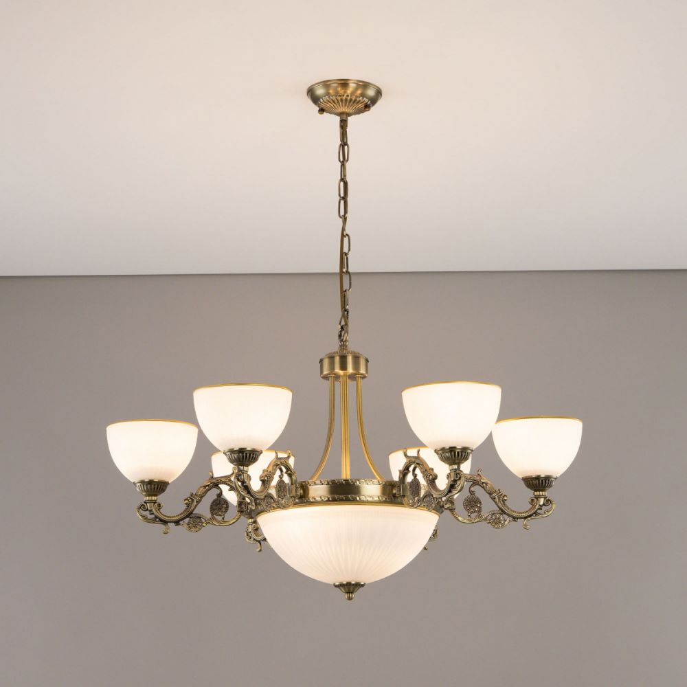 Крупная подвесная люстра Citilux Адриана CL405293 с центральным плафоном выполнена в классическом стиле. Корпус светильника металлический, с литыми рожками, цвет бронза. Плафоны стеклянные, матовые, рифленые с благородной золотистой окантовкой. Конструкция позволяет собрать модель как подвесную люстру, с плафонами направленными вверх, дающую мягкий отраженный свет или более яркий вариант с плафонами вниз. Если в помещении низкие потолки, изделие можно собрать вообще без элементов цепи, как потолочную люстру с рожками вниз высотой всего 47см. Более того, можно скоммутировать светильник для работы, как с одноклавишным, так и с двухклавишным выключателем. В модели используются 6 ламп с цоколем Е27 и мощностью 75Вт в боковых плафонах и 3 лампы с цоколем Е14 и мощностью 60Вт в центральном плафоне. Светодиодные лампы можно использовать более яркие. Тип крепления к потолку – планка. ХАРАКТЕРИСТИКИ Вес и габариты упаковки Длина (мм) 370 Высота (мм) 410 Ширина (мм) 370 Вес (грамм) 7340 Прочие Тип cветильника Люстра подвесная Коллекция Адриана Мощность общая, Вт 630 Освещаемая площадь - кв.м 25 Высота мин, мм 470 Высота, мм 1200 Диаметр, мм 800 Стиль Классика Для любого потолка, в т.ч.натяжного Да С регулировкой высоты Да Место применения Гостиная / Спальня / Кухня / Кабинет / Кафе / Зал ШтрихКод 5790080134003 Форма светильника Плафоны Степень защиты IP IP20 Срок гарантии, месяцев 12 Лампы - Количество 9 Световой поток, Lm 6900 Арматура - Материал Металл Арматура - Цвет Бронза Арматура - Поверхность Блестящая Материал плафонов Стекло Цвет плафонов Белый / Бронза Поверхность плафонов Матовая Форма плафонов Круглый Виды ламп Накаливания / Светодиодные / Галогеновые / Компактные люмин. Цоколь Е14 / Е27 С этим товаром смотрятОтзывы о Люстра Подвесная Citilux Адриана CL405293 Бронза / Ситилюкс.Отзывов пока не было. Вы можете оставить его первым