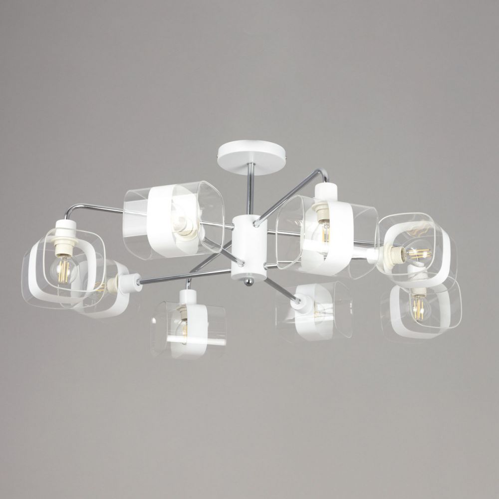 Потолочная люстра Citilux Бертон CL140180 в современном стиле. Корпус металлический, белого цвета, с декоративными хромированными элементами. Плафоны стеклянные, прозрачные, с декоративной белой полосой. В изделии используются 8 ламп с цоколем Е14, максимальной мощностью для ламп накаливания 60Вт (В комплект не входит приобретается отдельно). Светильник можно использовать как с одноклавишным, так и с двухклавишным выключателем. Подходит для всех типов потолков, в том числе натяжных, тип крепления – планка. Люстра восьмирожковая, размер 76х76см, высота 30,5см. ХАРАКТЕРИСТИКИ Вес и габариты упаковки Длина (мм) 560 Высота (мм) 200 Ширина (мм) 240 Вес (грамм) 3270 Прочие Тип cветильника Люстра потолочная Коллекция Бертон Мощность общая, Вт 480 Освещаемая площадь - кв.м 25 Высота, мм 310 Диаметр, мм 760 Стиль Современный Для любого потолка, в т.ч.натяжного Да На двойной выключатель Да Место применения Гостиная / Спальня / Кухня / Зал ШтрихКод 5790080137349 Форма светильника Плафоны Степень защиты IP IP20 Срок гарантии, месяцев 12 Лампы - Мощность макс, Вт 60 Лампы - Количество 8 Световой поток, Lm 7200 Арматура - Материал Металл Арматура - Цвет Белый Арматура - Поверхность Матовая Материал плафонов Стекло Цвет плафонов Прозрачный Поверхность плафонов Блестящая Форма плафонов Квадратный Цоколь Е14 Отзывы о Люстра Потолочная Citilux Бертон CL140180 Белая / Ситилюкс.Отзывов пока не было. Вы можете оставить его первым