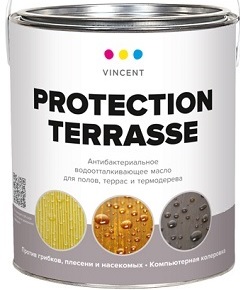 Описание Масло Деревозащитное Vincent Protection Terrasse 0.9л для Полов, Террас и Термодерева / Винсент Протексьон Террас.Представляет собой раствор модифицированного льняного масла в уайт-спирите c добавлением алкидной смолы, сиккатива и других добавок