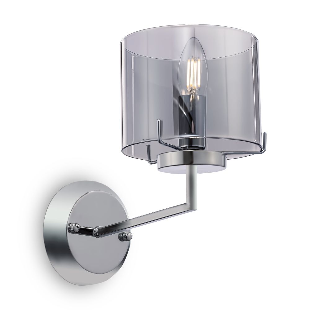 Хромированная металлическая арматура. Плафоны выполнены из дымчатого стекла. Гальваническое напыление создает зеркальный эффект. Плафоны крепятся на скобы, что облегчает эксплуатацию. Источник света – лампа с цоколем E14.