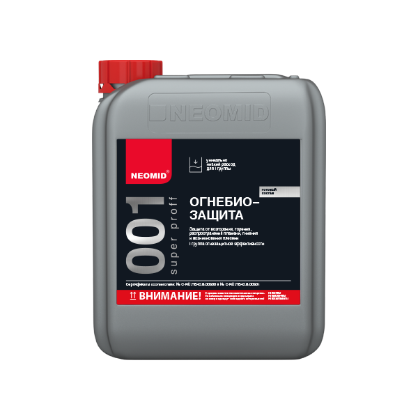 Описание Огнебиозащита Neomid 001 Super proff 12кг 1 Группа Защиты + КМ1 / Неомид 001.Высокоэффективный состав для комплексной защиты от возгорания и распространения пламени, а также гниения, возникновения плесени, поражения насекомыми-древоточцами деревянных конструкций и изделий (стен, балок, строительных систем, несущих брусьев, перекрытий, лаг, оконных и дверных блоков и т.д.), внутри и снаружи помещений, в условиях исключающих вымывание водой.