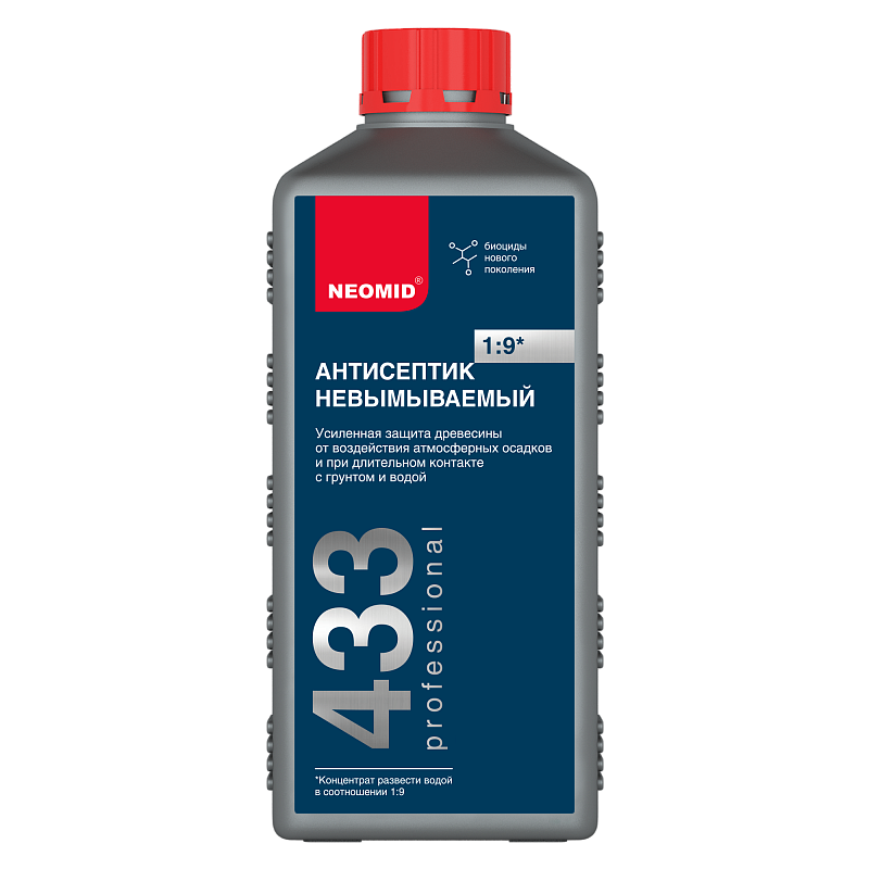 Описание Антисептик Neomid 433 30л Невымываемый, Усиленный, Зеленый, Концентрат (1:9) для Внутренних и Наружных Работ / Неомид 433.NEOMID Антисептик Невымываемый Усиленный – консервирующий невымываемый антисептик нового поколения для эффективной долговременной защиты различных пород древесины в тяжелых условиях эксплуатации, в том числе при длительном контакте с грунтом и влагой – Классы использования с 1 по 4 (EN 335:2013).
