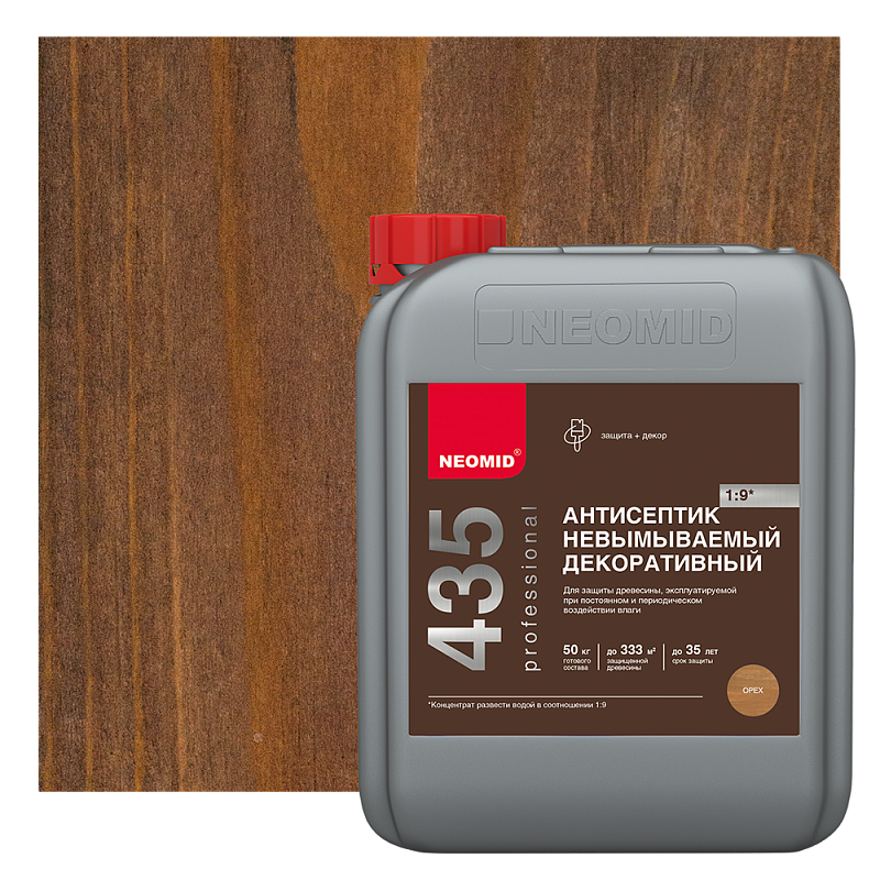 Описание Антисептик Невымываемый Neomid 435 30л Концентрат (1:9) Орех для Внутренних и Наружных Работ / Неомид 435.«NEOMID 435 Антисептик невымываемый» для наружных и внутренних работ, придает древесине благородный коричневый оттенок. Подчеркивает естественную структуру древесины.