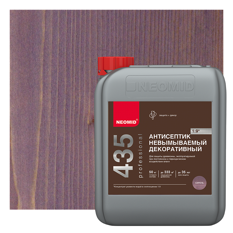 Описание Антисептик Невымываемый Neomid 435 0.5л Концентрат (1:9) Сирень для Внутренних и Наружных Работ / Неомид 435.«NEOMID 435 Антисептик невымываемый» для наружных и внутренних работ, придает древесине благородный коричневый оттенок. Подчеркивает естественную структуру древесины.