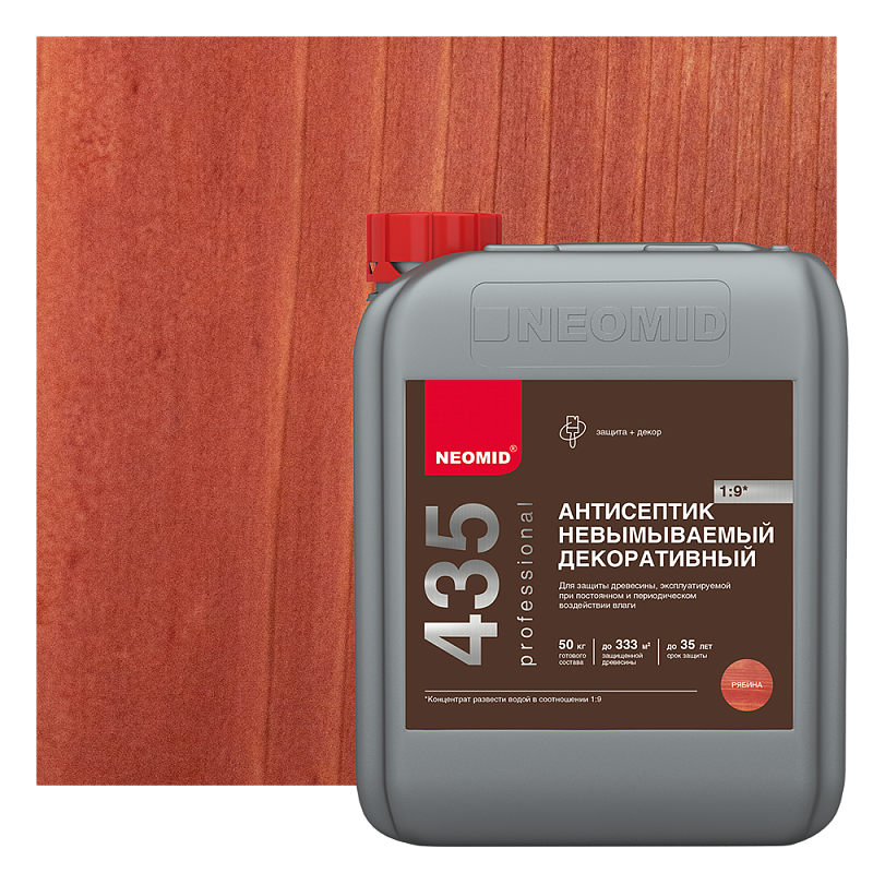 Описание Антисептик Невымываемый Neomid 435 30л Концентрат (1:9) Рябина для Внутренних и Наружных Работ / Неомид 435.«NEOMID 435 Антисептик невымываемый» для наружных и внутренних работ, придает древесине благородный коричневый оттенок. Подчеркивает естественную структуру древесины.