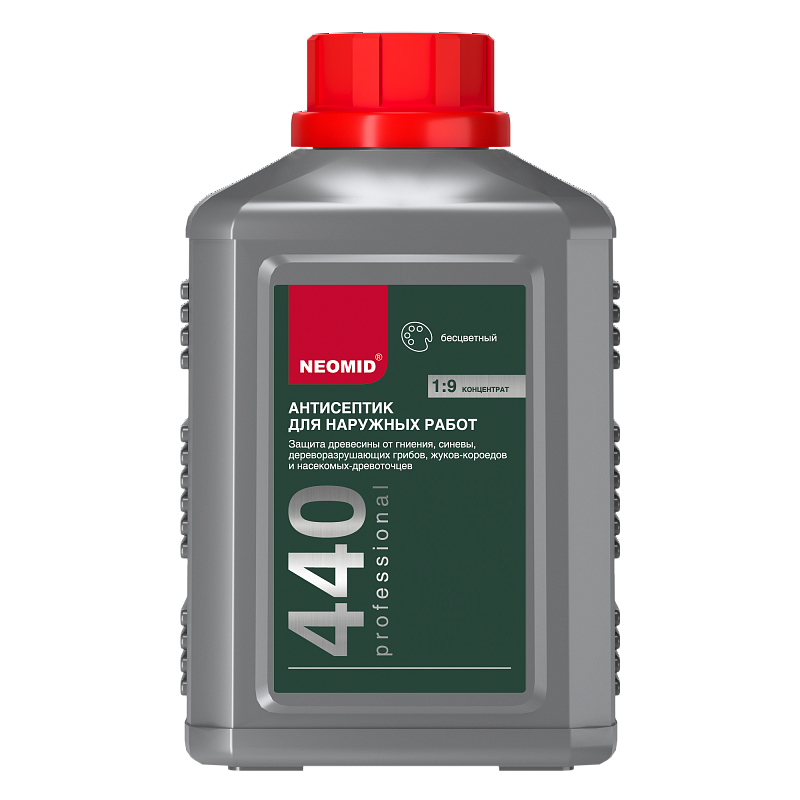NEOMID 440 ECO — бесцветное средство для наружных и внутренних работ, в том числе для помещений с повышенной влажностью. Предназначено для защиты древесины различных пород от гниения, поражения дереворазрушающими и деревоокрашивающими плесневыми грибами, насекомыми-древоточцами, водорослями, мхами, лишайниками на срок до 25 лет (если закрыт пленкообразующим составом, например, лессирующим средством NEOMID BiOCOLOR).