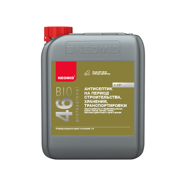 Описание Антисептик на Период Строительства Neomid 46 BIO 1л Концентрат (1:19) / Неомид 46 Био.NEOMID 46 BiO предназначен для защиты: древесины на период хранения и транспортировки, объектов деревянного домостроения на период строительства, паллет, используемых при хранении и транспортировки пищевых продуктов. Эффективно защищает древесину от гниения, поражения дереворазрушающими и деревоокрашивающими плесневыми грибами, насекомыми-древоточцами, водорослями, мхами, лишайниками на срок до 8 месяцев.