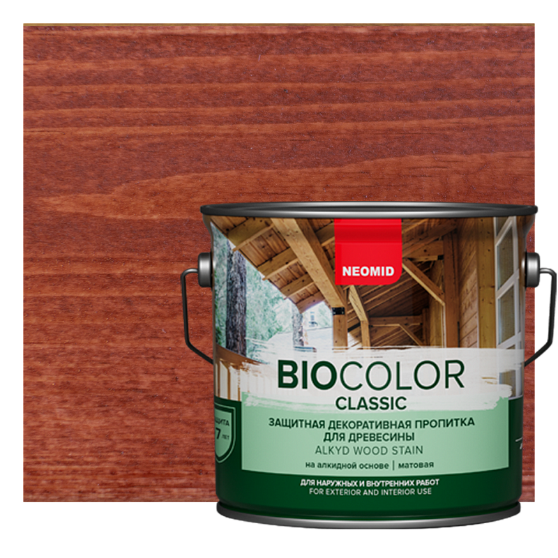Описание Декоративная Пропитка для Древесины Neomid Biocolor Classic 0.9л Махагон Полуматовая, Глубокопроникающая / Неомид Био Колор Классик.NEOMID Bio Color Classic — деревозащитный декоративный глубокопроникающий состав на алкидной основе для эффективной защиты и декоративной отделки деревянных поверхностей. Обладает хорошей пропитывающей способностью и образует на поверхности полуматовую защитную пленку с высокими декоративными и защитными свойствами. Благодаря входящим в состав активным добавкам образующееся покрытие имеет трехступенчатую систему защиты деревянной поверхности. СВОЙСТВА:
