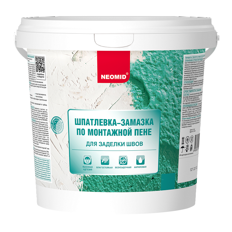 По монтажной пене: Поверхность очистить от жира, пыли и грязи, старые непрочные покрытия удалить, срезать высохшую монтажную пену. Поверхности, пораженные плесенью, очистить специализированными составами NEOMID. Перед нанесением шпатлевки поверхность рекомендуется загрунтовать соответствующим грунтом NEOMID. ПРИМЕНЕНИЕ Шпатлевку тщательно перемешать. В случае загустевания разбавить небольшим количеством воды (до консистенции густой сметаны). Внимание! При излишнем разбавлении возможно появление трещин.Нанести на пену первый тонкий слой шпатлевки металлическим шпателем, вдавливая ее в пену. Каждый последующий слой наносить на поверхность после полного высыхания предыдущего слоя. Рекомендуемая толщина одного слоя не более 2 см. Для получения ровной гладкой поверхности через 5-15 минут после нанесения выгладить шпатлевку шпателем или пластмассовой теркой. ВРЕМЯ ВЫСЫХАНИЯ: При относительной влажности 70% и температуре +20°С время высыхания слоя толщиной 1 см – до 48 часов. Окончательное время высыхания зависит от свойств поверхности. РАСХОД: Зависит от толщины слоя и объема заделываемых щелей, трещин, отверстий и пр. ОЧИСТКА ИНСТРУМЕНТА: Инструменты сразу после окончания работ промыть водой. МЕРЫ ПРЕДОСТОРОЖНОСТИ: Пожаровзрывобезопасна. При попадании на кожу или в глаза промыть большим количеством воды. При проглатывании обратиться к врачу. Хранить в недоступном для детей месте. При работе использовать индивидуальные средства защиты. СОСТАВ: синтетический латекс, микроволокна, наполнители, вода, функциональные добавки, биоцид. ХРАНЕНИЕ И ТРАНСПОРТИРОВКА: Хранить в плотно закрытой таре при температуре от +5°С до +30°С. Выдерживает пять циклов кратковременного замораживания-оттаивания. В случае замерзания выдержать при комнатной температуре, тщательно перемешать. Утилизировать как бытовой отход. СРОК ГОДНОСТИ: 12 месяцев. Использование