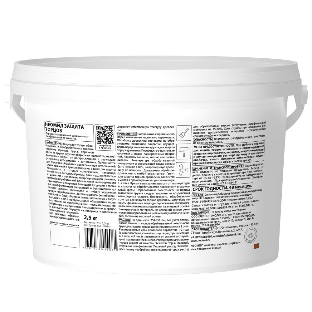 Описание Состав для Защиты Торцов Neomid Tor Plus 2.5кг Эластичный / Неомид Тор Плюс.*NEOMID TOR PLUS защищает торцы обработанных и необработанных лесоматериалов (бревен, бруса, обрезной доски и других крупногабаритных пиломатериалов) различных пород от растрескивания в результате усушечных деформаций и загнивания.Применяется для торцевой обработки древесины при естественной сушке, хранении и транспортировке, а также для защиты поверхности в готовых конструкциях, например жилые дома: беседки, веранды, бани и др.;