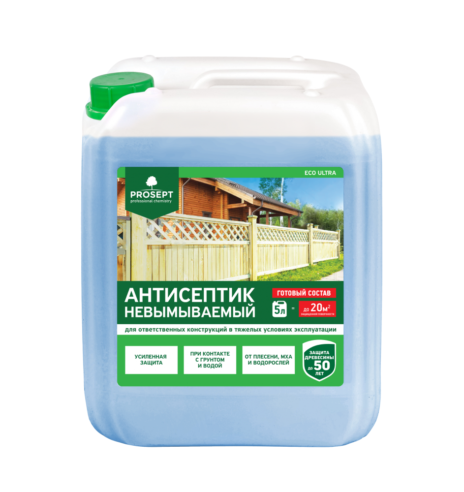 Описание Антисептик Невымываемый Prosept Eco Ultra 5л для Древесины Эксплуатируемой в Неблагоприятных Условиях / Просепт Эко Ультра.PROSEPT ECO ULTRA — невымываемая антисептическая пропитка для конструкций из древесины эксплуатируемой в наиболее неблагоприятных условиях. Предназначается для усиленной защиты древесины различных пород в тяжелых условиях эксплуатации — при длительном контакте с грунтом и прямом воздействии атмосферных осадков. Обеспечивает защиту от домового грибка, гнили, плесени, насекомых-древоточцев на срок до 50 лет и более в зависимости от метода обработки и условий службы древесины.