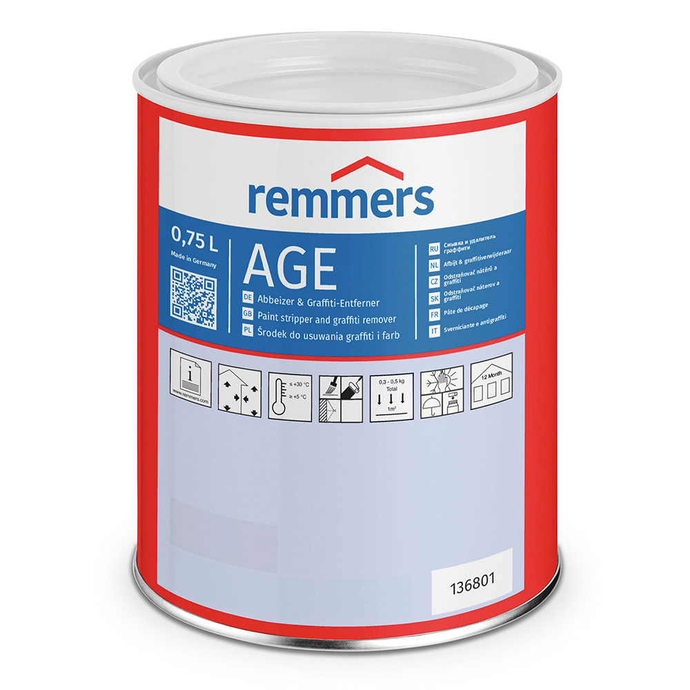 Продукт Remmers AGE удаляет дисперсионные лакокрасочные покрытия, покрытия на чистом акрилатном связующем, спиртосодержащие лаки, политуры, а также граффити с деревянных, металлических и минеральных оснований.
