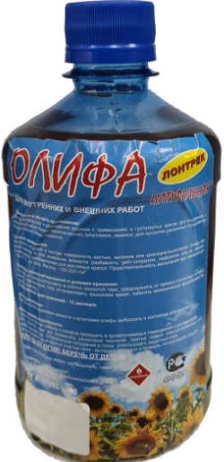 Состав: олифа натуральная вырабатывается из льняного (или конопляного) масла с добавлением сиккативов (ускорителей высыхания). Внешний вид: олифа образует тонкое, прозрачное, не вуалирующее структуру древесины, покрытие слегка желтоватого цвета. Применение