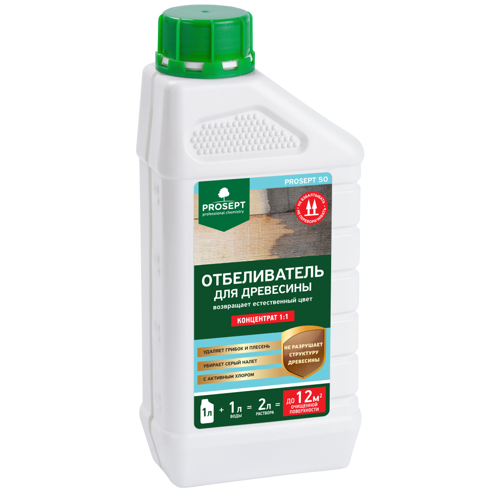 Описание Отбеливатель-Концентрат для Древесины 1л Prosept 50 для Внутренних и Наружных Работ / Просепт 50.PROSEPT 50 — концентрат, предназначенный для отбеливания древесины. Эффективно удаляет поражающие древесину деревоокрашивающие грибы, плесень, обесцвечивает серый налет.